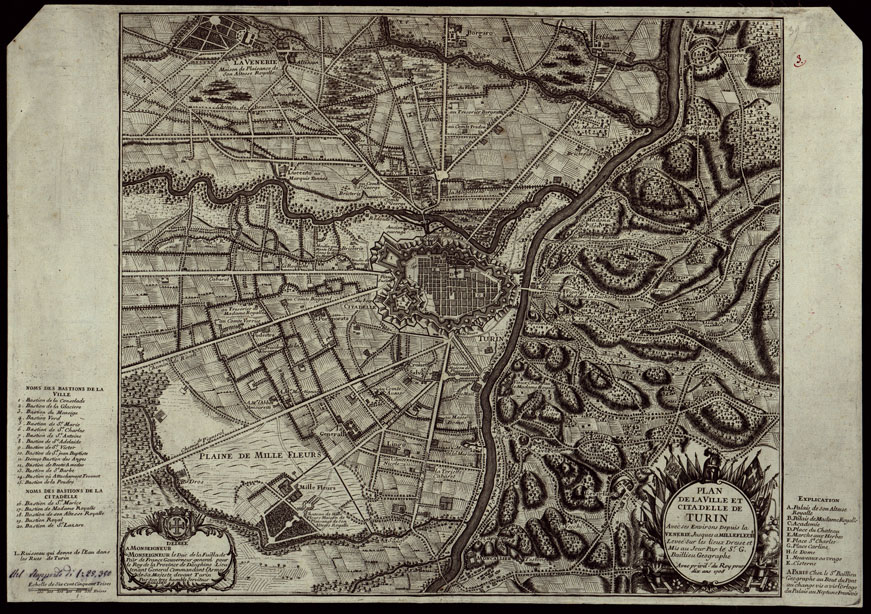 PLAN DE LA VILLE ET CITADELLE DE TURIN AVEC SES ENVIRONS DEPUIS LA VENERIE JUSQUES A MILLEFLEURS LEVEE SUR LES LIEUX DRESSE ET MIS AU JOUR PAR LE S.R.G. BAITTIEN GEOGRAPHE AVEC PIVIL DU ROY POUR DIX ANS 1708.