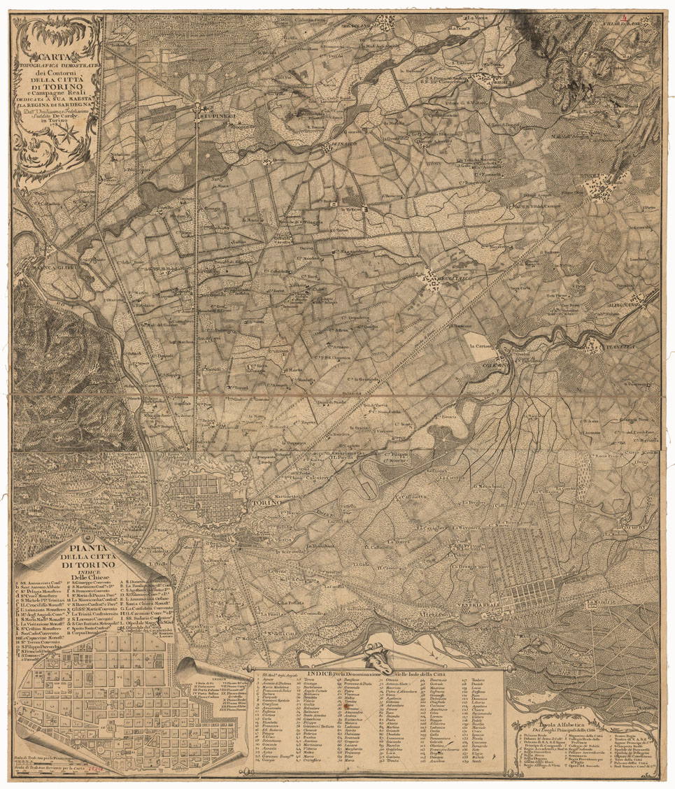 "Incisione su rame montata su tela a stacchi, stampata in nero. Orografia rappresentata con rudimentale tratteggio. Assai dettagliata la rete stradale. In basso "Pianta della Città di Torino" con elenchi numerici ed alfabetici delle Chiese e dei luoghi principali della Città. Scale grafiche in trabucchi."