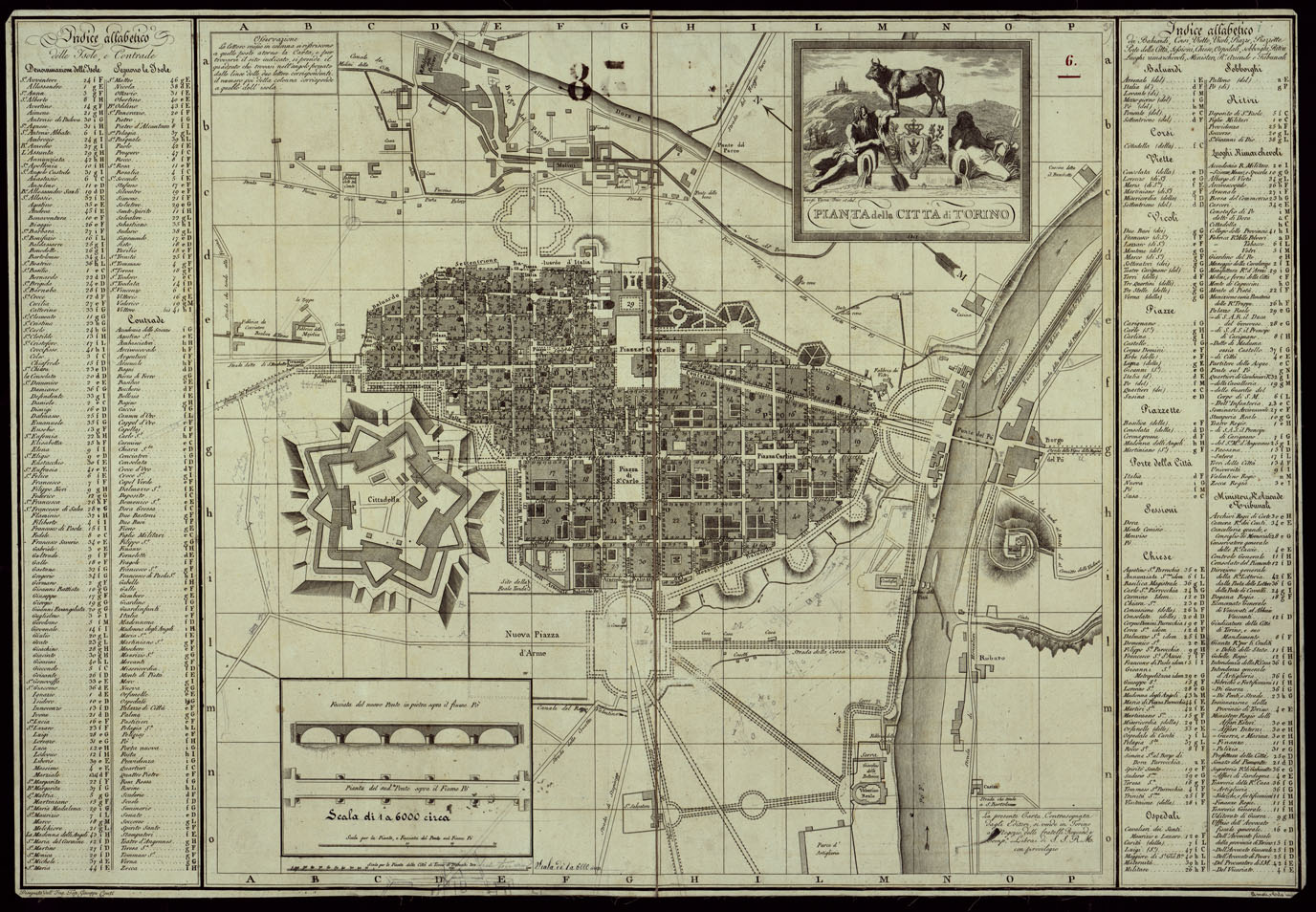 "Luigi Vacca. Foglio unico montato su tela a stacchi disegnato dall'Ingegnere Top. Giuseppe Conti, inciso da Amati e Tela. Stampa in nero. A destra e a sinistra indice alfabetico delle strade e degli edifici pubblici. Scala grafica in trabucchi."