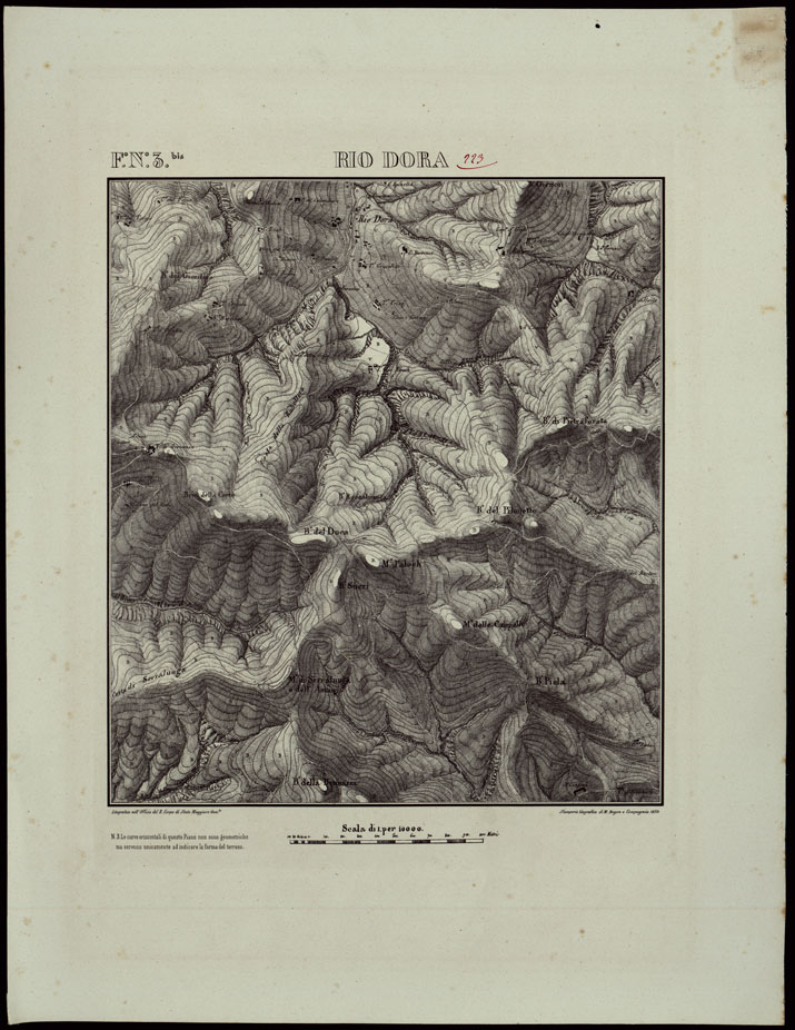 "Il documento si compone di tre esemplari, due in tredici fogli e uno in dodici, più un quadro d'unione e la copertina del documento. I fogli sono stati litografati nell'Officina del R. Corpo di Stato Maggiore Generale, stampati da M. Doyen e Comp. con orografia a curve di livello dimostrative sussidiate da tratteggio."