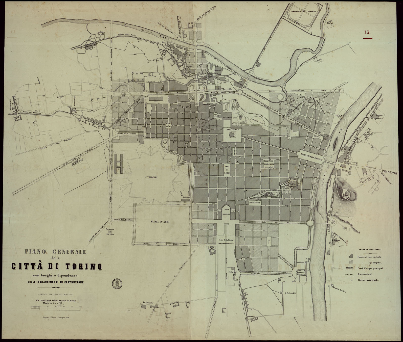 PIANO GENERALE DELLA CITTA' DI TORINO SUOI BORGHI E DIPENDENZE COGLI INGRANDIMENTI IN COSTRUZIONE PER CURA DEL MUNICIPIO ALLA SCALA META' DELLA CAMERALE DI SAVOJA OSSIA DI 1 A 4.725