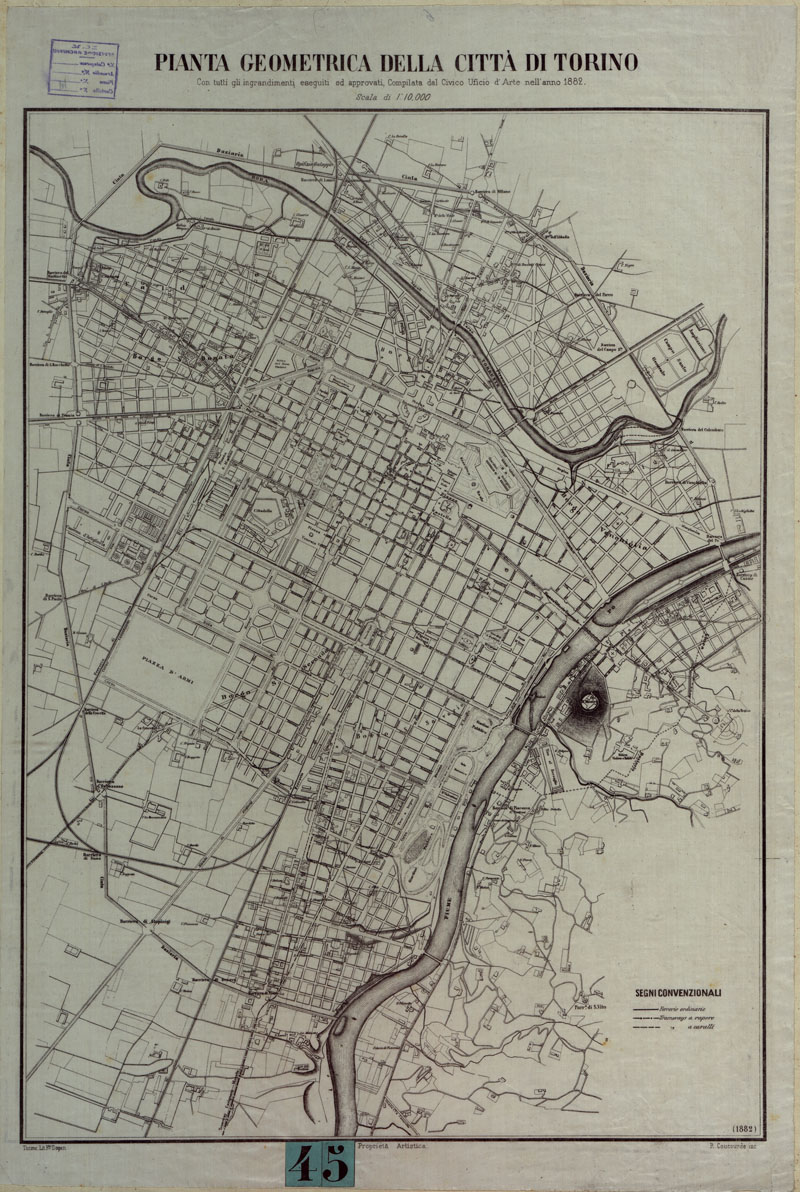 PIANTA GEOMETRICA DELLA CITTA' DI TORINO. CON TUTTI GLI INGRANDIMENTI ESEGUITI E APPROVATI, COMPILATA DAL CIVICO UFFICIO D'ARTE NELL'ANNO 1882