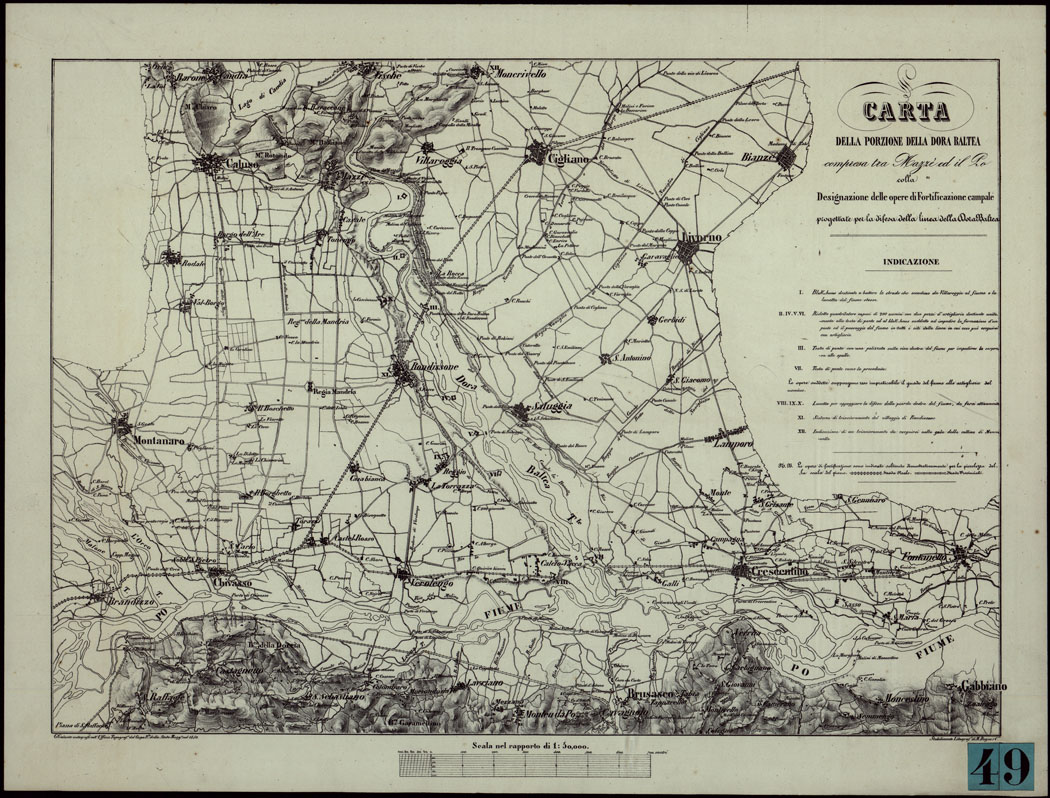 CARTA DELLA PORZIONE DELLA DORA BALTEA COMPRESA TRA MAZZE' ED IL PO' COLLA DESIGNAZIONE DELLE OPERE DI FORTIFICAZIONE CAMPALE PROGETTATE PER LA DIFESA DELLA LINEA DELLA DORA BALTEA.