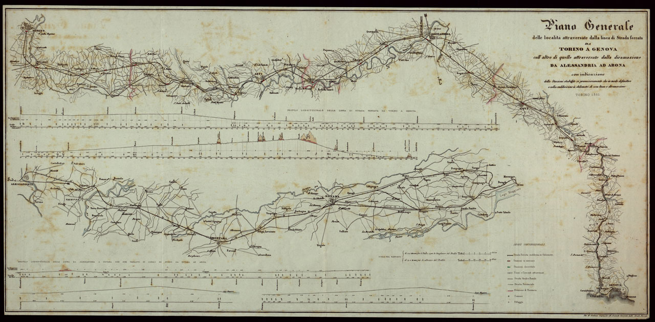 "Stabilite si provvisoriamente che in modo definitivo e colla suddivisione in chilometri di essa linea e diramazione TORINO 1851. Un foglio stampato a colori con la sola planimetria ed il profilo della linea (scala per le altezze 1:15.000)"