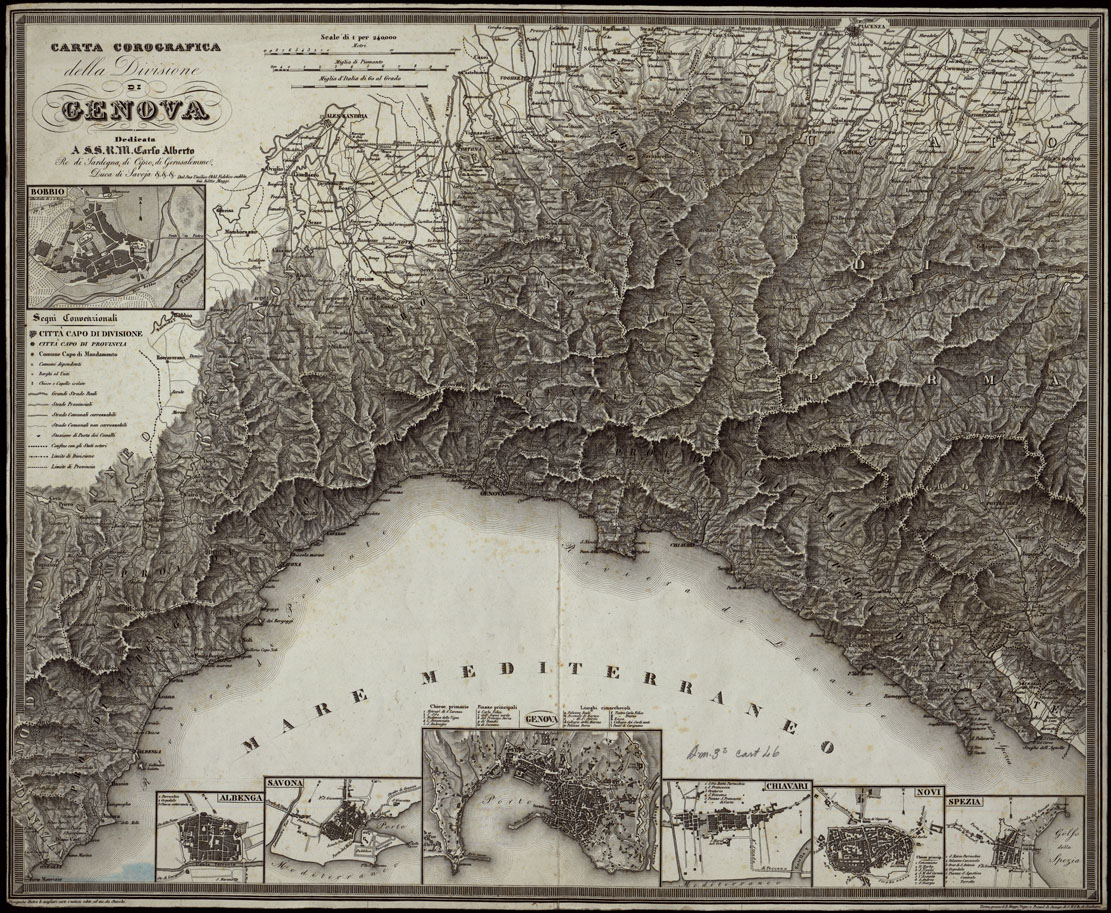 CARTA COROGRAFICA DELLA DIVISIONE DI GENOVA DEDICATA A. S. S. R. M. CARLO ALBERTO RE DI SARDEGNA, DI CIPRO, DI GERUSALEMME, DUCA DI SAVOJA &.&.&. DAL SUO UMILISS OBBL. FEDELISS. SUDDITO GIO' BATTA MAGGI.