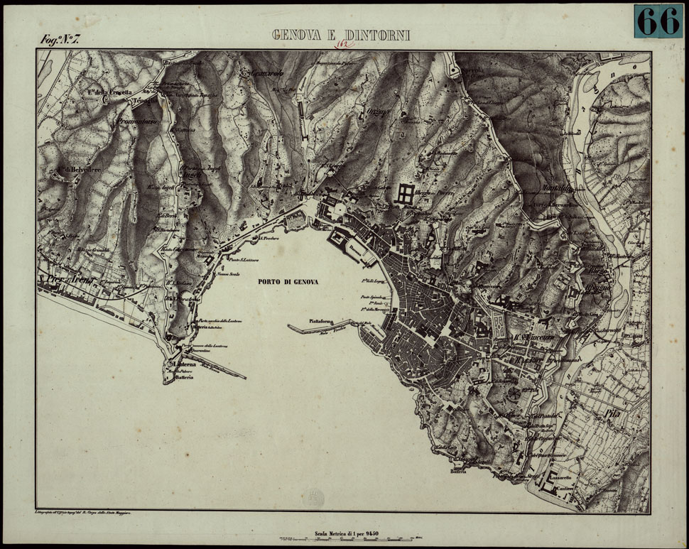 CARTA TOPOGRAFICA DEI DINTORNI DI GENOVA (PARTE NORD-EST) ALLA SCALA DI 1 al 9450 LITOGRAFIZZATA NEL 1851 - Fog. N.°7.