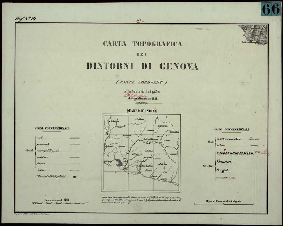 CARTA TOPOGRAFICA DEI DINTORNI DI GENOVA (PARTE NORD-EST) ALLA SCALA DI 1 al 9450 LITOGRAFIZZATA NEL 1851 - Fog. N.°10. - QUADRO D'UNIONE E SEGNI CONVENZIONALI.