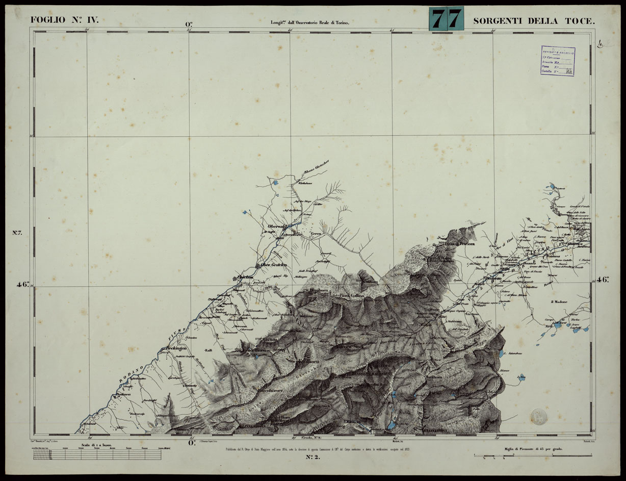 CARTA TOPOGRAFICA DEGLI STATI IN TERRAFERMA DI S.M. IL RE DI SARDEGNA ALLA SCALA DI 1A 50.000. OPERA DEL CORPO REALE DELLO STATO MAGGIORE - FOGLIO N.°IV SORGENTI DELLA TOCE