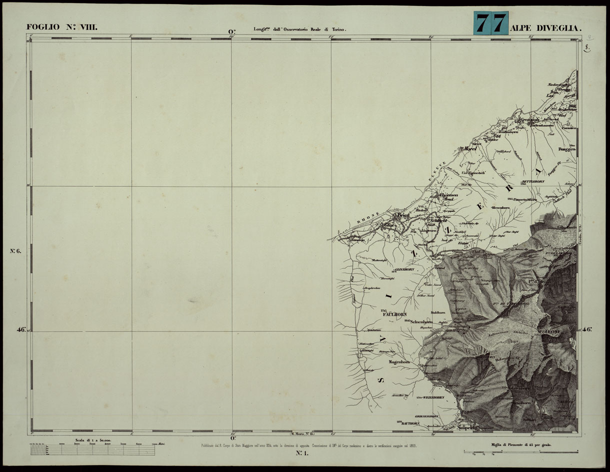 CARTA TOPOGRAFICA DEGLI STATI IN TERRAFERMA DI S.M. IL RE DI SARDEGNA ALLA SCALA DI 1A 50.000. OPERA DEL CORPO REALE DELLO STATO MAGGIORE - FOGLIO N.°VIII ALPE DIVEGLIA
