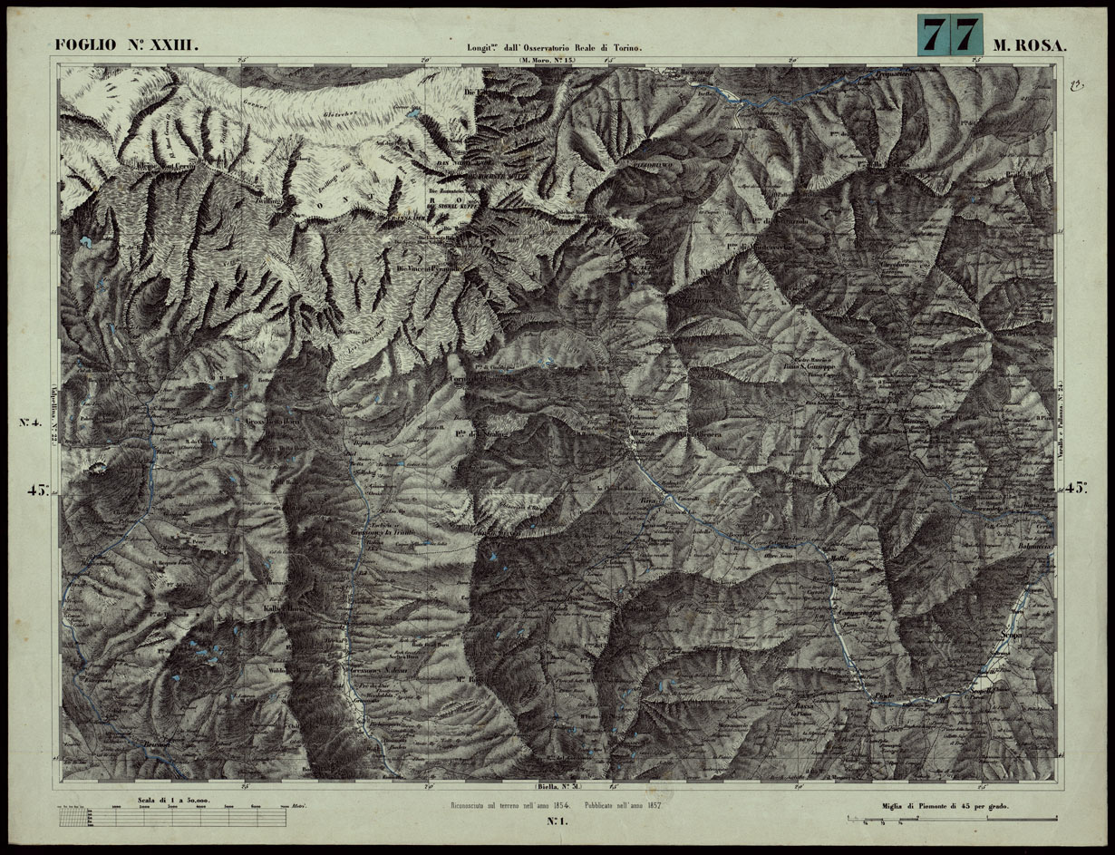 CARTA TOPOGRAFICA DEGLI STATI IN TERRAFERMA DI S.M. IL RE DI SARDEGNA ALLA SCALA DI 1A 50.000. OPERA DEL CORPO REALE DELLO STATO MAGGIORE - FOGLIO N.°XXIII MONTE ROSA