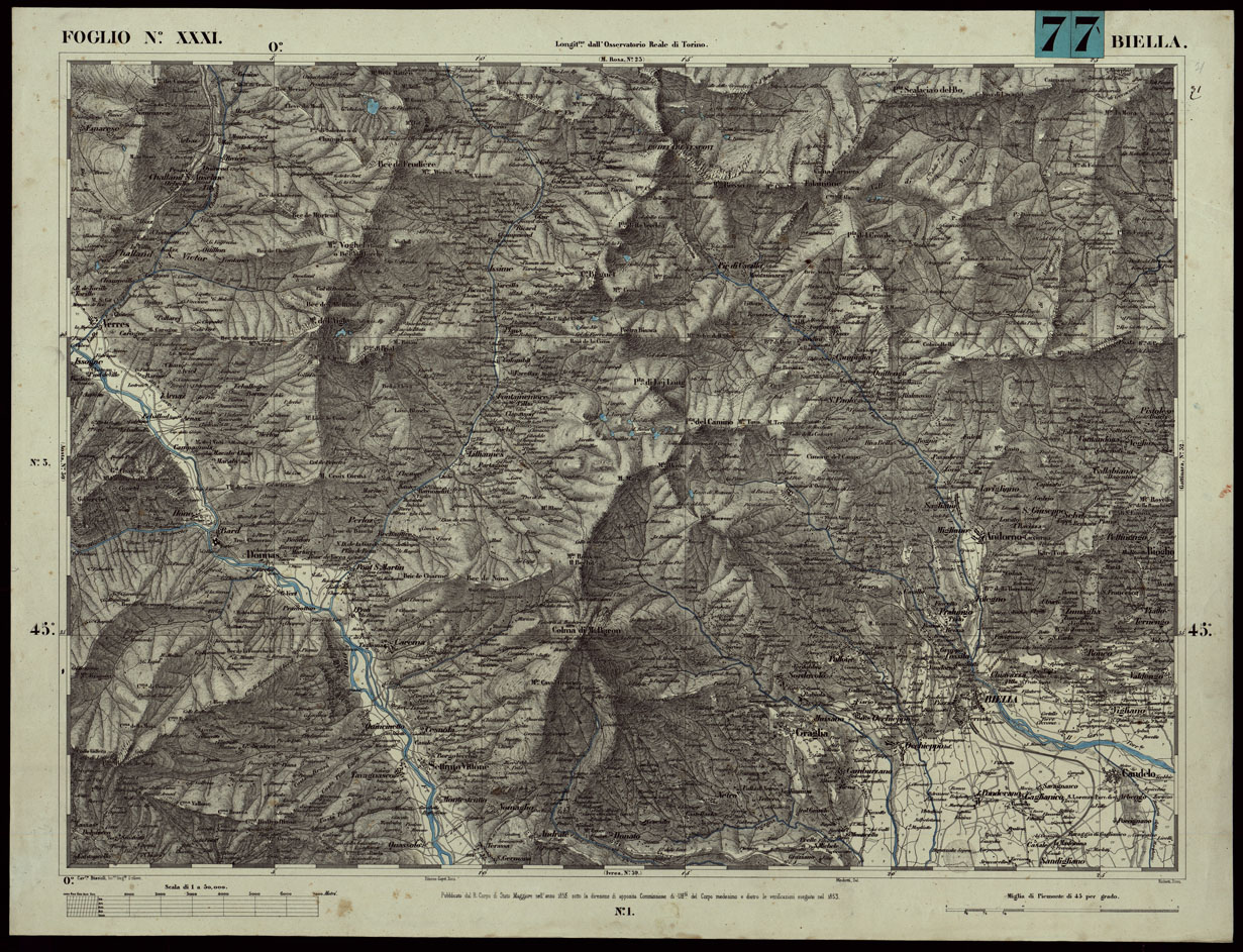 CARTA TOPOGRAFICA DEGLI STATI IN TERRAFERMA DI S.M. IL RE DI SARDEGNA ALLA SCALA DI 1A 50.000. OPERA DEL CORPO REALE DELLO STATO MAGGIORE - FOGLIO N.°XXXI BIELLA