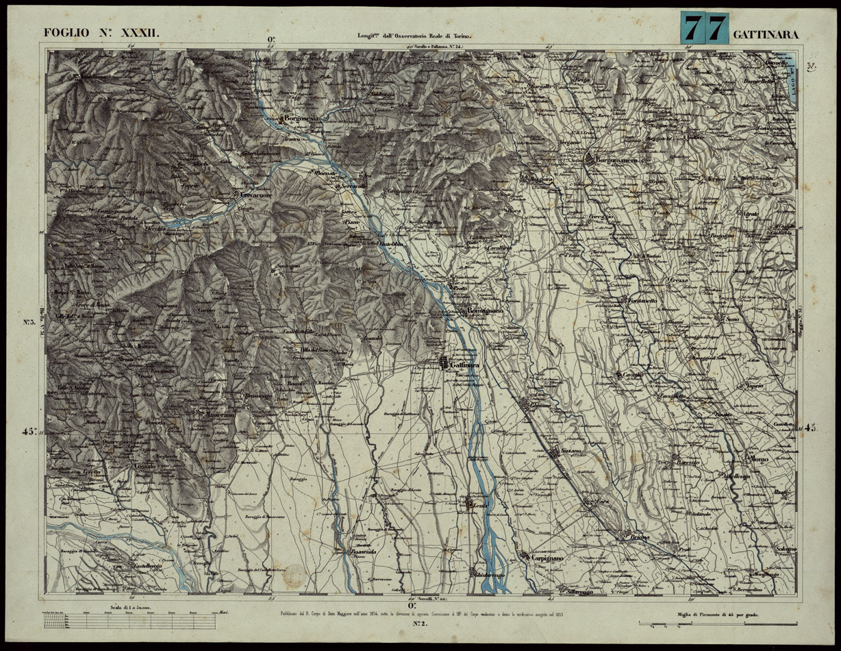 CARTA TOPOGRAFICA DEGLI STATI IN TERRAFERMA DI S.M. IL RE DI SARDEGNA ALLA SCALA DI 1A 50.000. OPERA DEL CORPO REALE DELLO STATO MAGGIORE - FOGLIO N.°XXXII GATTINARA