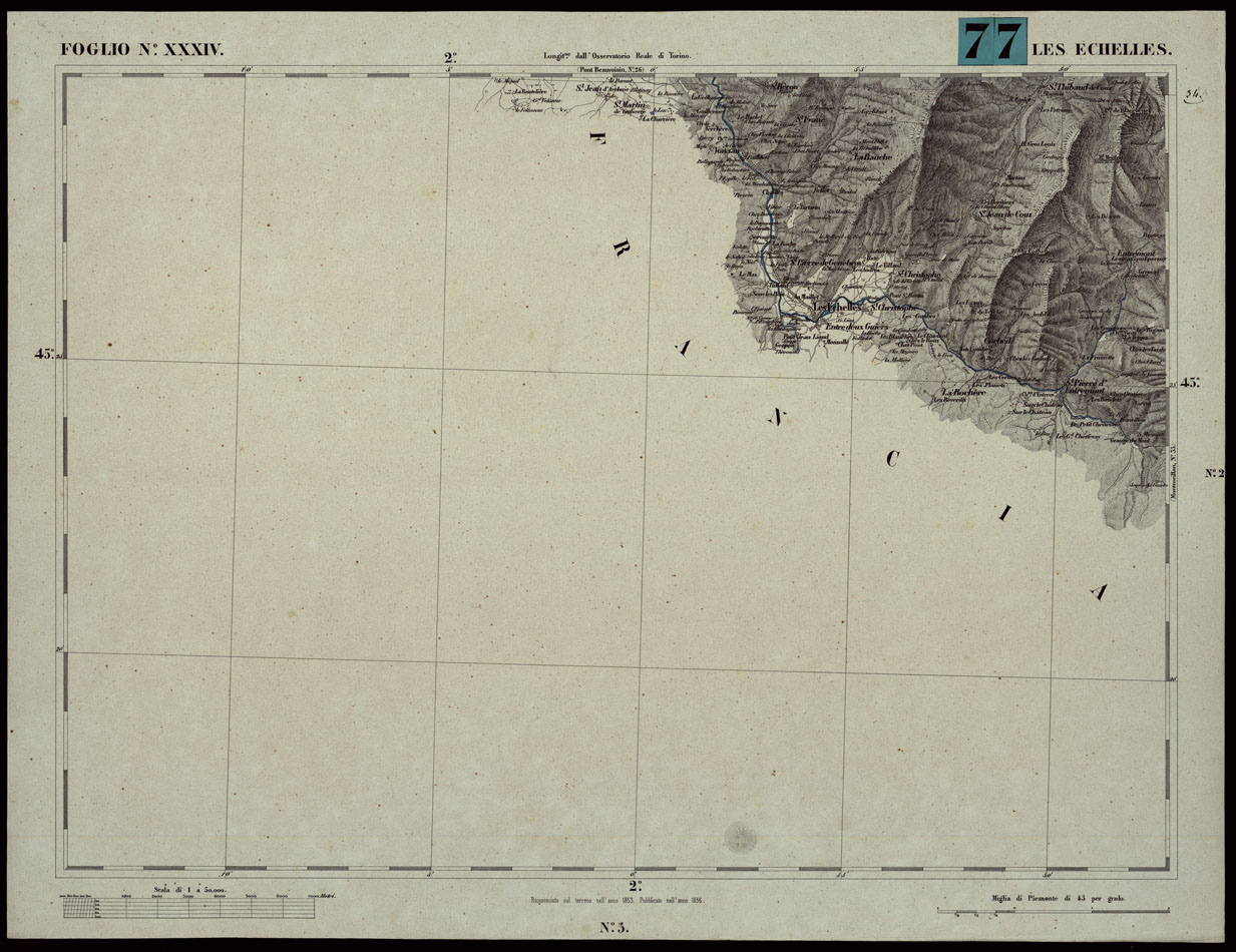 CARTA TOPOGRAFICA DEGLI STATI IN TERRAFERMA DI S.M. IL RE DI SARDEGNA ALLA SCALA DI 1A 50.000. OPERA DEL CORPO REALE DELLO STATO MAGGIORE - FOGLIO N.°XXXIV LES ECHELLES