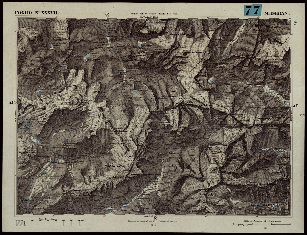 CARTA TOPOGRAFICA DEGLI STATI IN TERRAFERMA DI S.M. IL RE DI SARDEGNA ALLA SCALA DI 1A 50.000. OPERA DEL CORPO REALE DELLO STATO MAGGIORE - FOGLIO N.°XXXVII MONTE ISERAN