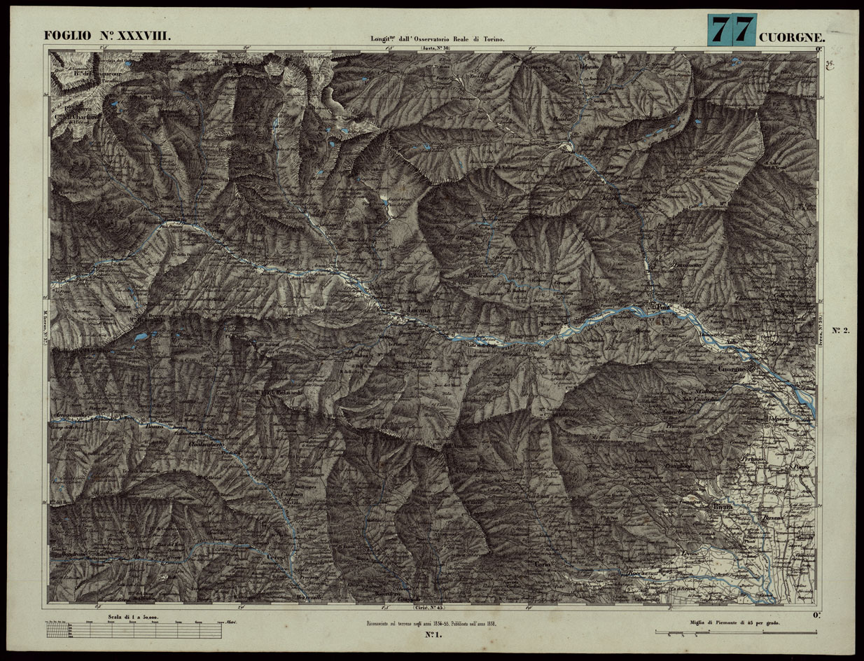 CARTA TOPOGRAFICA DEGLI STATI IN TERRAFERMA DI S.M. IL RE DI SARDEGNA ALLA SCALA DI 1A 50.000. OPERA DEL CORPO REALE DELLO STATO MAGGIORE - FOGLIO N.°XXXVIII CUORGNE
