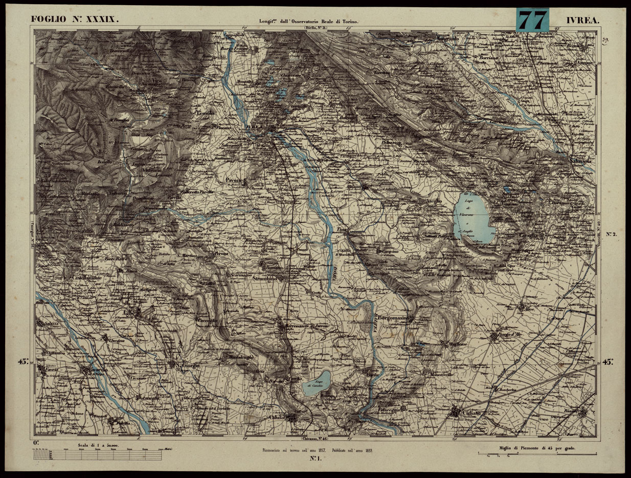 CARTA TOPOGRAFICA DEGLI STATI IN TERRAFERMA DI S.M. IL RE DI SARDEGNA ALLA SCALA DI 1A 50.000. OPERA DEL CORPO REALE DELLO STATO MAGGIORE - FOGLIO N.°XXXIX IVREA