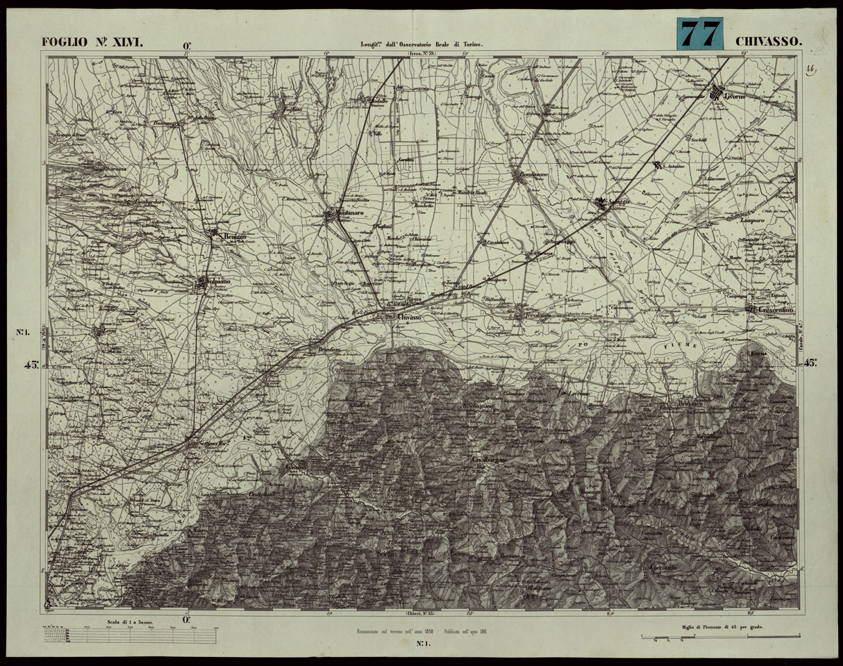 CARTA TOPOGRAFICA DEGLI STATI IN TERRAFERMA DI S.M. IL RE DI SARDEGNA ALLA SCALA DI 1A 50.000. OPERA DEL CORPO REALE DELLO STATO MAGGIORE - FOGLIO N.°XLVI CHIVASSO