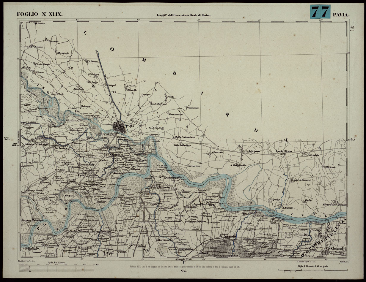 CARTA TOPOGRAFICA DEGLI STATI IN TERRAFERMA DI S.M. IL RE DI SARDEGNA ALLA SCALA DI 1A 50.000. OPERA DEL CORPO REALE DELLO STATO MAGGIORE - FOGLIO N.°XLIX PAVIA