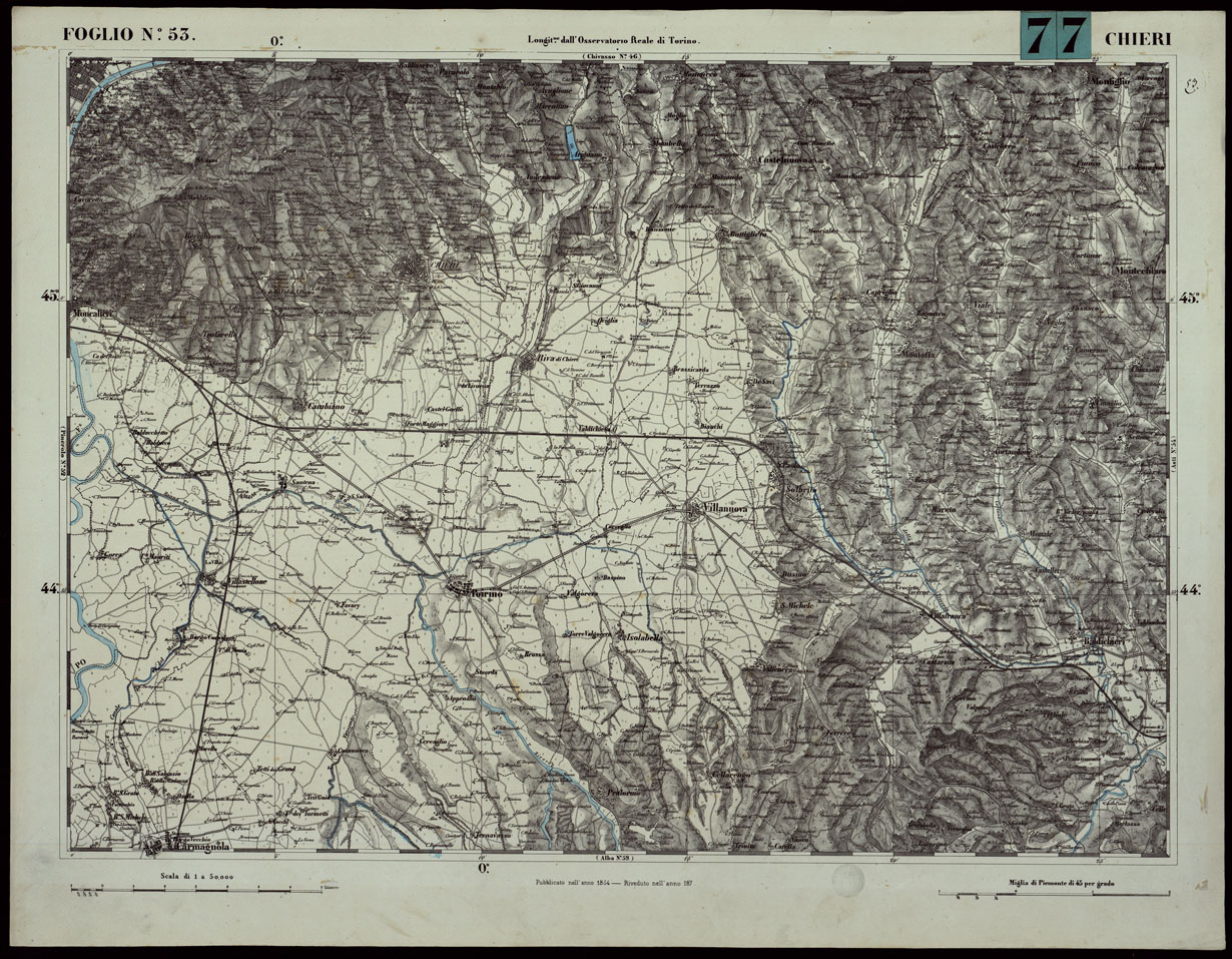 CARTA TOPOGRAFICA DEGLI STATI IN TERRAFERMA DI S.M. IL RE DI SARDEGNA ALLA SCALA DI 1A 50.000. OPERA DEL CORPO REALE DELLO STATO MAGGIORE - FOGLIO N.°53 CHIERI