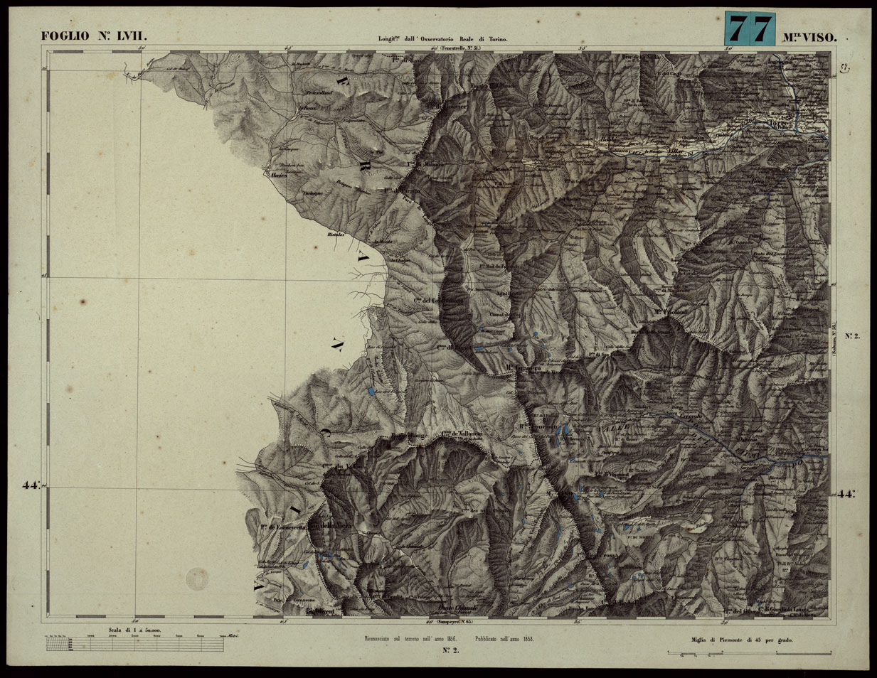 CARTA TOPOGRAFICA DEGLI STATI IN TERRAFERMA DI S.M. IL RE DI SARDEGNA ALLA SCALA DI 1A 50.000. OPERA DEL CORPO REALE DELLO STATO MAGGIORE - FOGLIO N.°LVII MONTE VISO