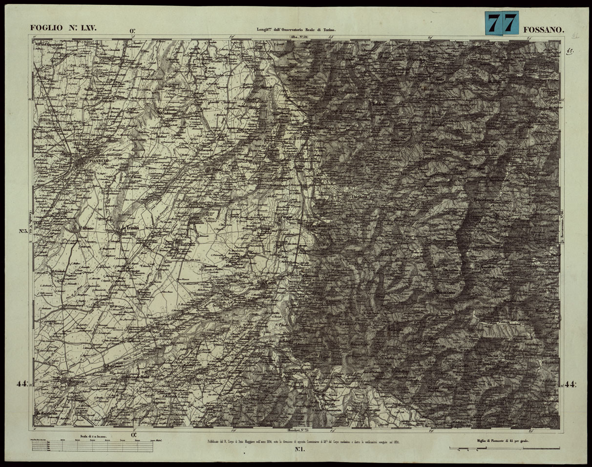 CARTA TOPOGRAFICA DEGLI STATI IN TERRAFERMA DI S.M. IL RE DI SARDEGNA ALLA SCALA DI 1A 50.000. OPERA DEL CORPO REALE DELLO STATO MAGGIORE - FOGLIO N.°LXV FOSSANO