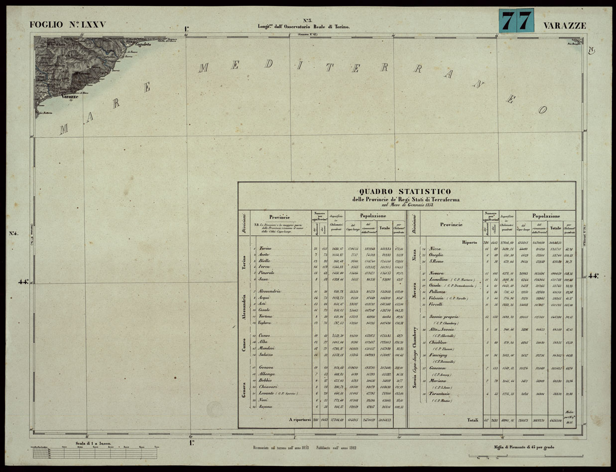 CARTA TOPOGRAFICA DEGLI STATI IN TERRAFERMA DI S.M. IL RE DI SARDEGNA ALLA SCALA DI 1A 50.000. OPERA DEL CORPO REALE DELLO STATO MAGGIORE - FOGLIO N.°LXXV VARAZZE