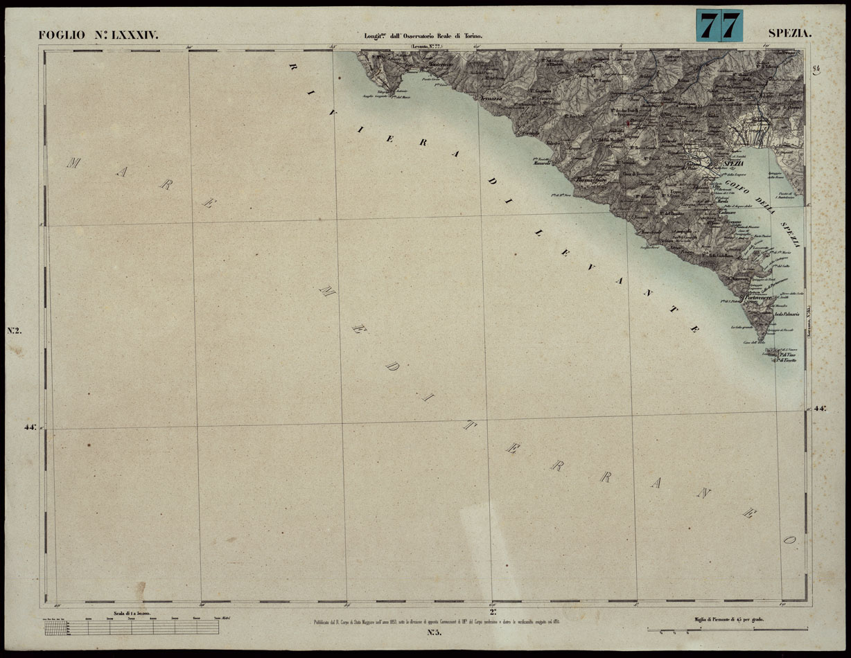 CARTA TOPOGRAFICA DEGLI STATI IN TERRAFERMA DI S.M. IL RE DI SARDEGNA ALLA SCALA DI 1A 50.000. OPERA DEL CORPO REALE DELLO STATO MAGGIORE - FOGLIO N.°LXXXIV SPEZIA