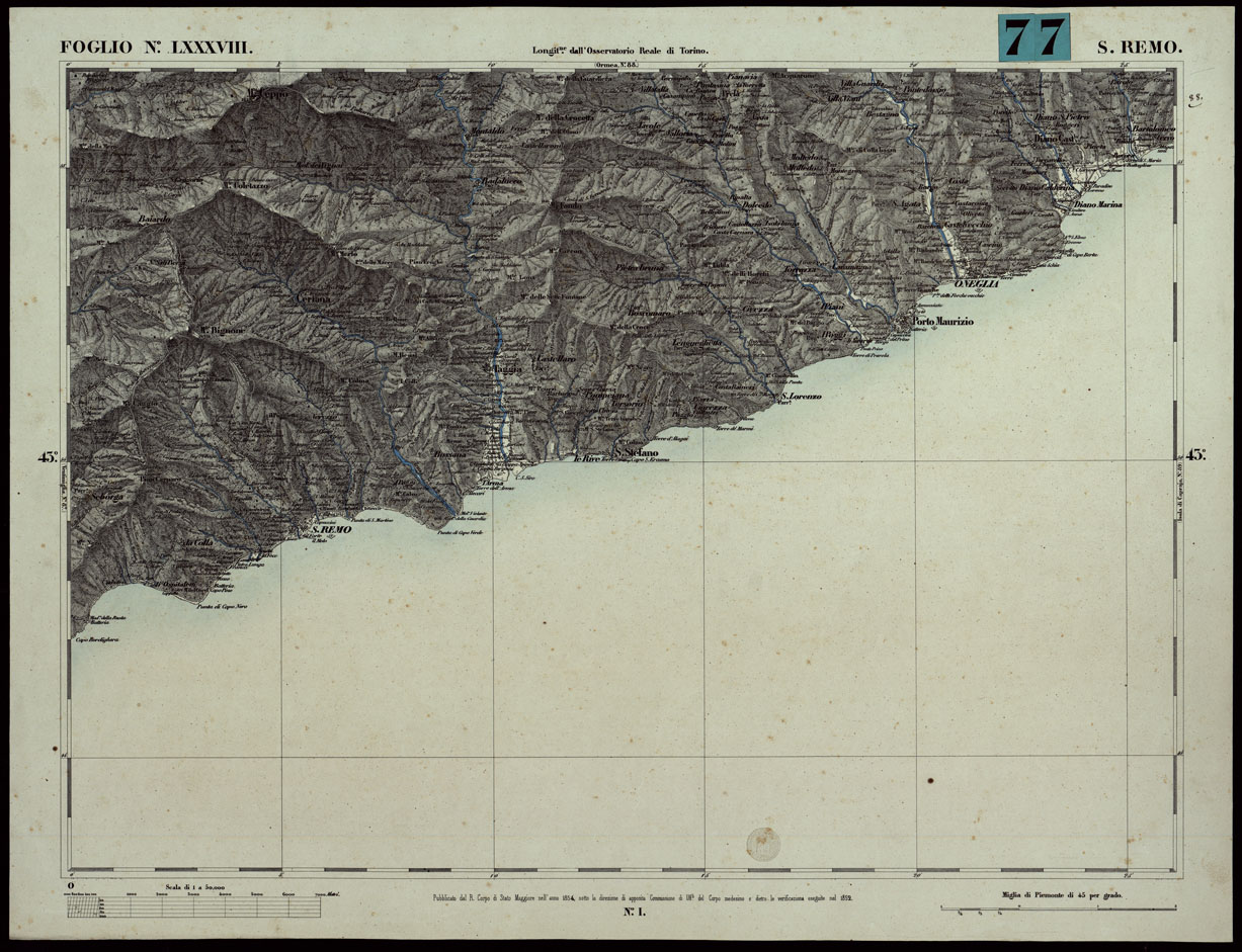 CARTA TOPOGRAFICA DEGLI STATI IN TERRAFERMA DI S.M. IL RE DI SARDEGNA ALLA SCALA DI 1A 50.000. OPERA DEL CORPO REALE DELLO STATO MAGGIORE - FOGLIO N.°LXXXVIII SAN REMO