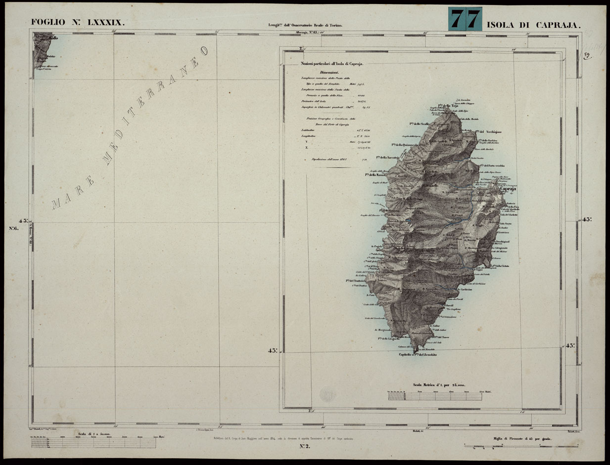 CARTA TOPOGRAFICA DEGLI STATI IN TERRAFERMA DI S.M. IL RE DI SARDEGNA ALLA SCALA DI 1A 50.000. OPERA DEL CORPO REALE DELLO STATO MAGGIORE - FOGLIO N.°LXXXIX ISOLA DI CAPRAJA