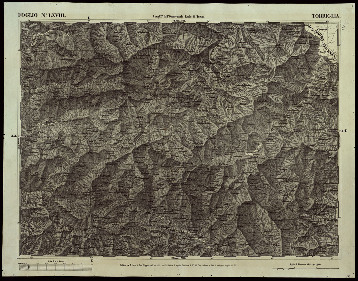 CARTA TOPOGRAFICA DEGLI STATI IN TERRAFERMA DI S.M. IL RE DI SARDEGNA ALLA SCALA DI 1A 50.000 OPERA DEL CORPO REALE DELLO STATO MAGGIORE RIVEDUTI E CORRETTI - FOGLIO N.° LXVIII TORRIGLIA