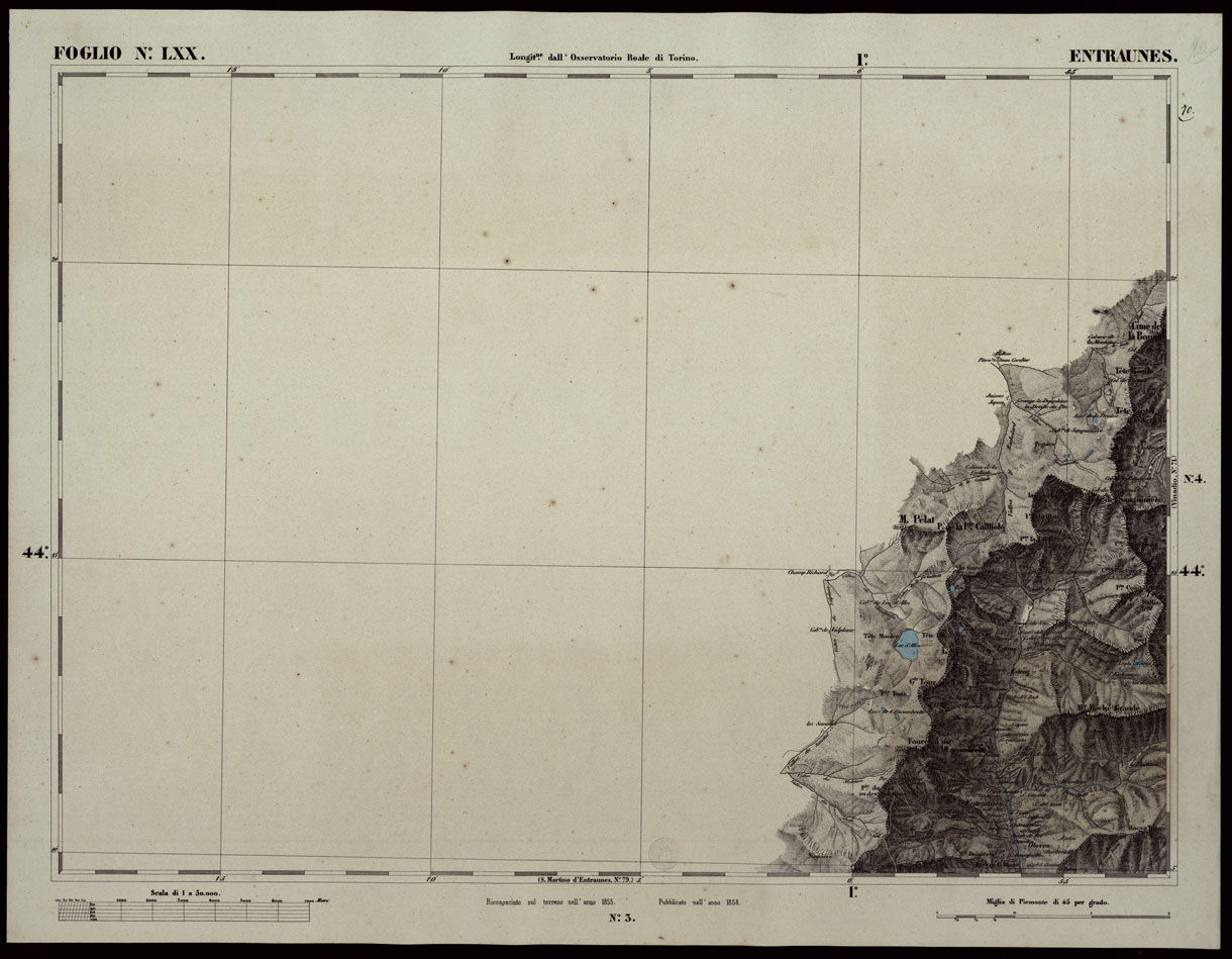 CARTA TOPOGRAFICA DEGLI STATI IN TERRAFERMA DI S.M. IL RE DI SARDEGNA ALLA SCALA DI 1A 50.000 OPERA DEL CORPO REALE DELLO STATO MAGGIORE RIVEDUTI E CORRETTI - FOGLIO N.° LXX ENTRAUNES