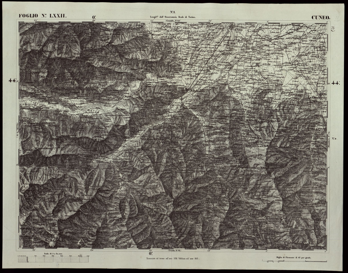 CARTA TOPOGRAFICA DEGLI STATI IN TERRAFERMA DI S.M. IL RE DI SARDEGNA ALLA SCALA DI 1A 50.000 OPERA DEL CORPO REALE DELLO STATO MAGGIORE RIVEDUTI E CORRETTI - FOGLIO N.° LXXII CUNEO