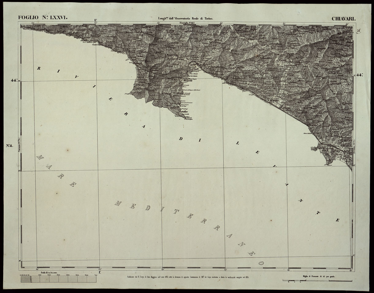 CARTA TOPOGRAFICA DEGLI STATI IN TERRAFERMA DI S.M. IL RE DI SARDEGNA ALLA SCALA DI 1A 50.000 OPERA DEL CORPO REALE DELLO STATO MAGGIORE RIVEDUTI E CORRETTI - FOGLIO N.° LXXVI CHIAVARI
