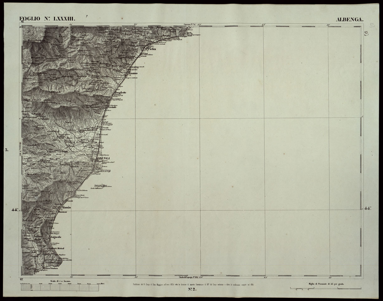 CARTA TOPOGRAFICA DEGLI STATI IN TERRAFERMA DI S.M. IL RE DI SARDEGNA ALLA SCALA DI 1A 50.000 OPERA DEL CORPO REALE DELLO STATO MAGGIORE RIVEDUTI E CORRETTI - FOGLIO N.° LXXXIII ALBENGA
