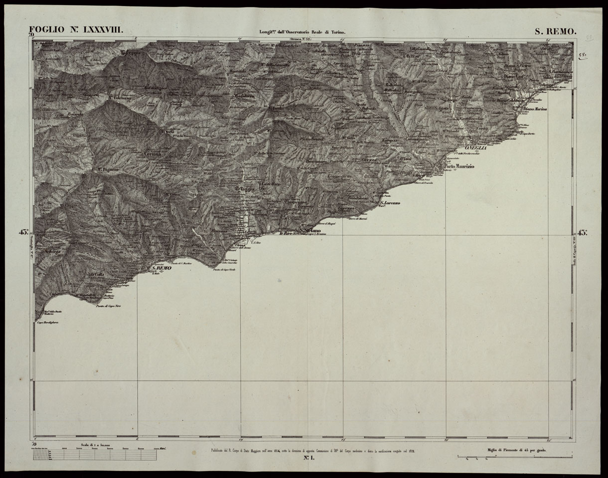 CARTA TOPOGRAFICA DEGLI STATI IN TERRAFERMA DI S.M. IL RE DI SARDEGNA ALLA SCALA DI 1A 50.000 OPERA DEL CORPO REALE DELLO STATO MAGGIORE RIVEDUTI E CORRETTI - FOGLIO N.° LXXXVIII SAN REMO