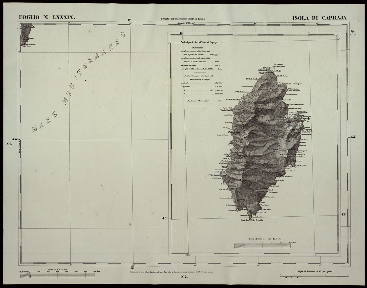 CARTA TOPOGRAFICA DEGLI STATI IN TERRAFERMA DI S.M. IL RE DI SARDEGNA ALLA SCALA DI 1A 50.000 OPERA DEL CORPO REALE DELLO STATO MAGGIORE RIVEDUTI E CORRETTI - FOGLIO N.° LXXXIX ISOLA DI CAPRAJA