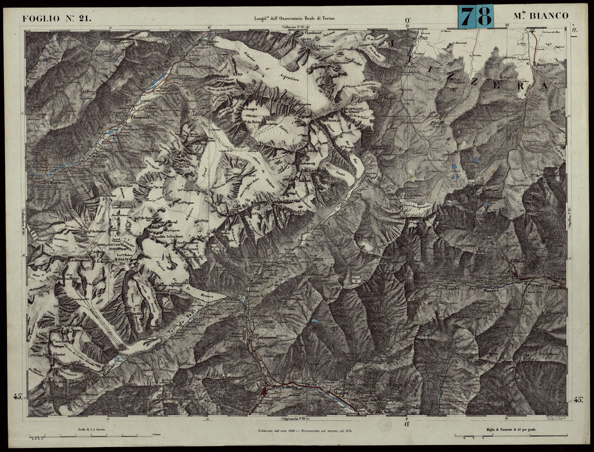 CARTA TOPOGRAFICA DEGLI STATI IN TERRAFERMA DI S.M. IL RE DI SARDEGNA ALLA SCALA DI 1.A 50.000. OPERA DEL CORPO REALE DELLO STATO MAGGIORE - FOGLIO N.°21. MONTE BIANCO