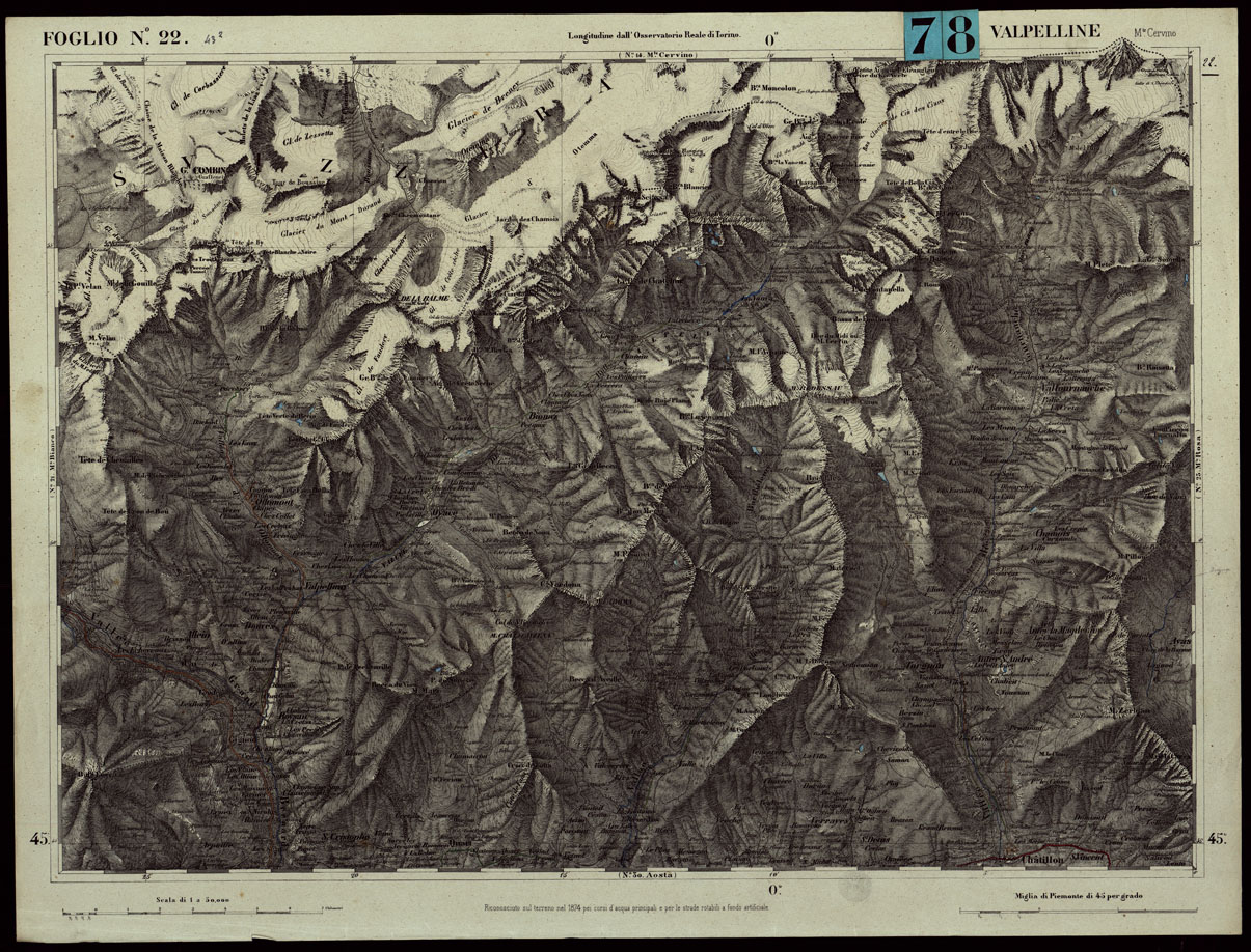 CARTA TOPOGRAFICA DEGLI STATI IN TERRAFERMA DI S.M. IL RE DI SARDEGNA ALLA SCALA DI 1.A 50.000. OPERA DEL CORPO REALE DELLO STATO MAGGIORE - FOGLIO N.°22. VALPELLINE