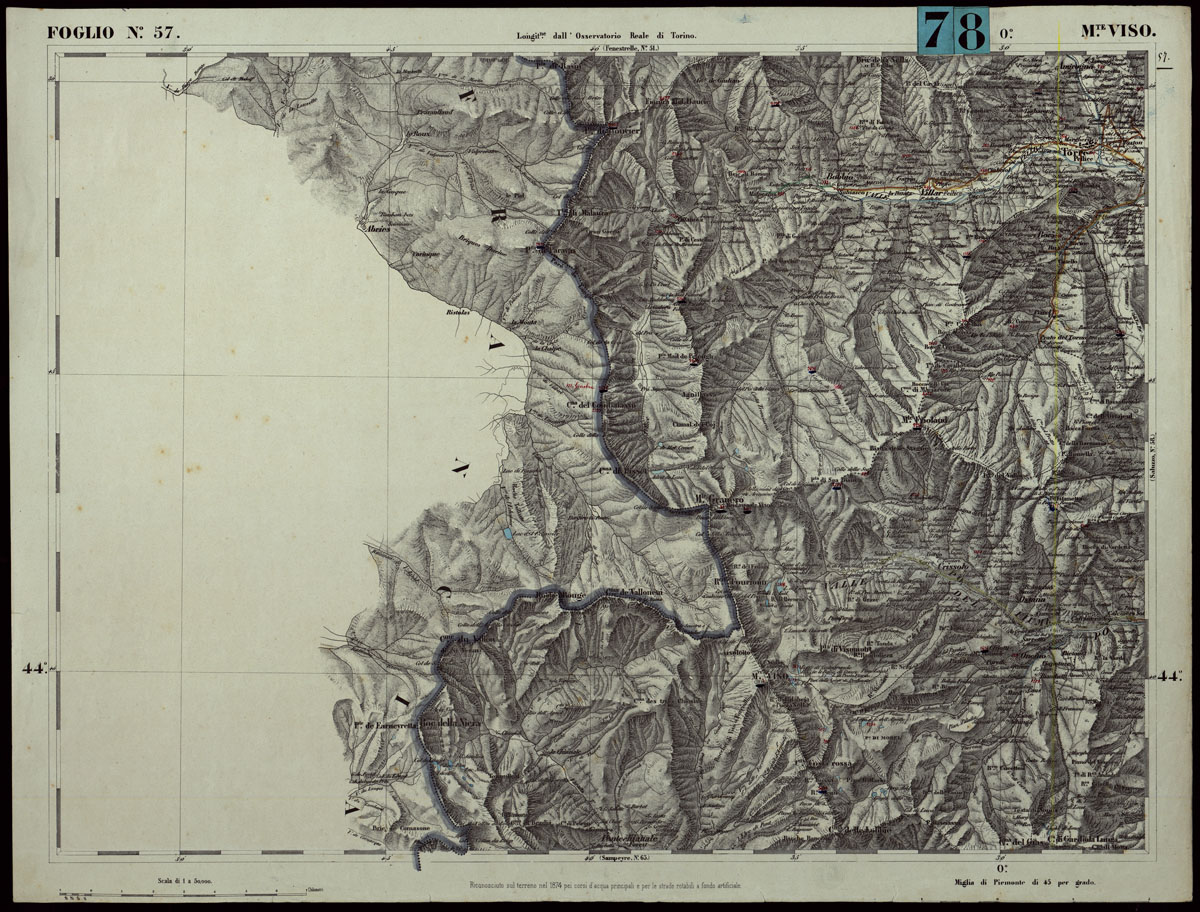 CARTA TOPOGRAFICA DEGLI STATI IN TERRAFERMA DI S.M. IL RE DI SARDEGNA ALLA SCALA DI 1.A 50.000. OPERA DEL CORPO REALE DELLO STATO MAGGIORE - FOGLIO N.°57. MONTE VISO