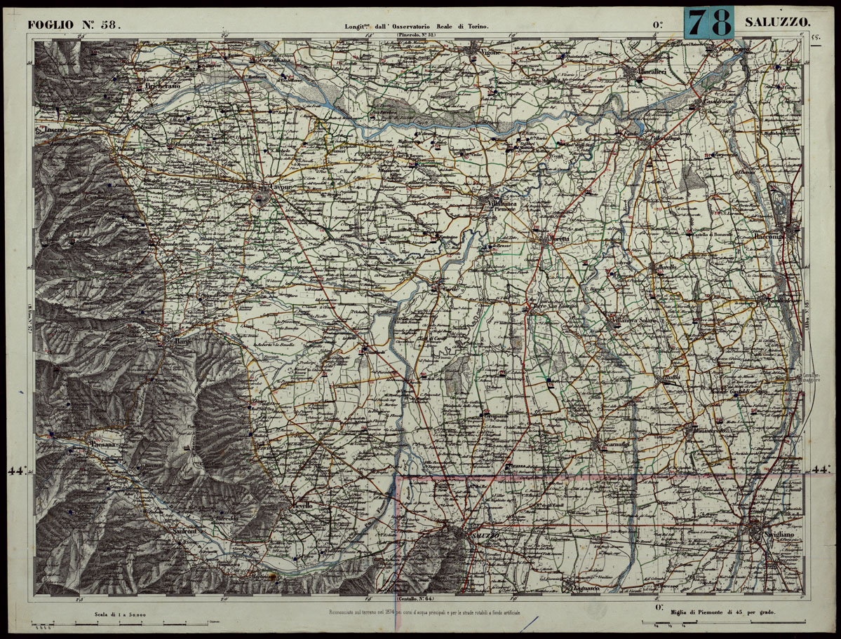 CARTA TOPOGRAFICA DEGLI STATI IN TERRAFERMA DI S.M. IL RE DI SARDEGNA ALLA SCALA DI 1.A 50.000. OPERA DEL CORPO REALE DELLO STATO MAGGIORE - FOGLIO N.°58 SALUZZO