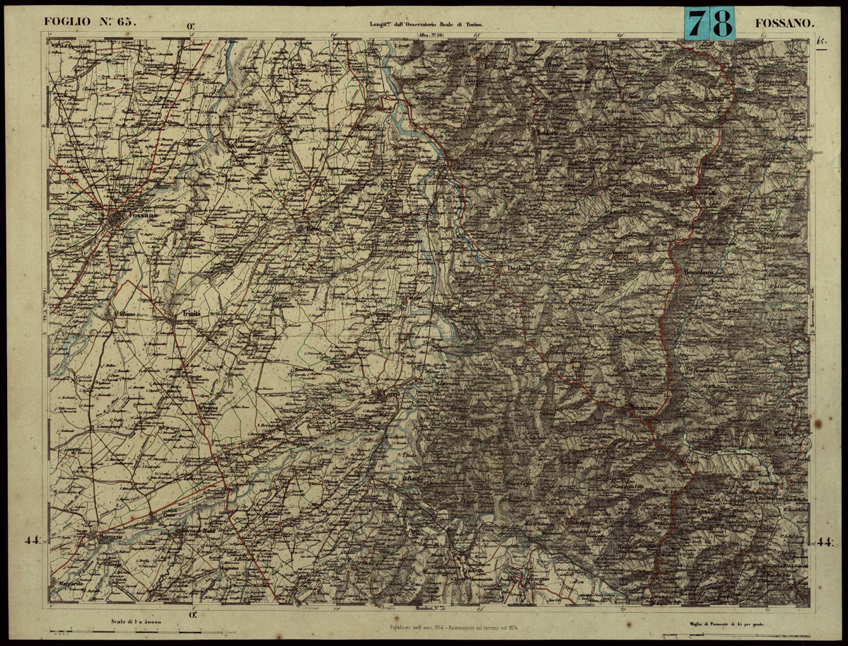 CARTA TOPOGRAFICA DEGLI STATI IN TERRAFERMA DI S.M. IL RE DI SARDEGNA ALLA SCALA DI 1.A 50.000. OPERA DEL CORPO REALE DELLO STATO MAGGIORE - FOGLIO N.°65. FOSSANO