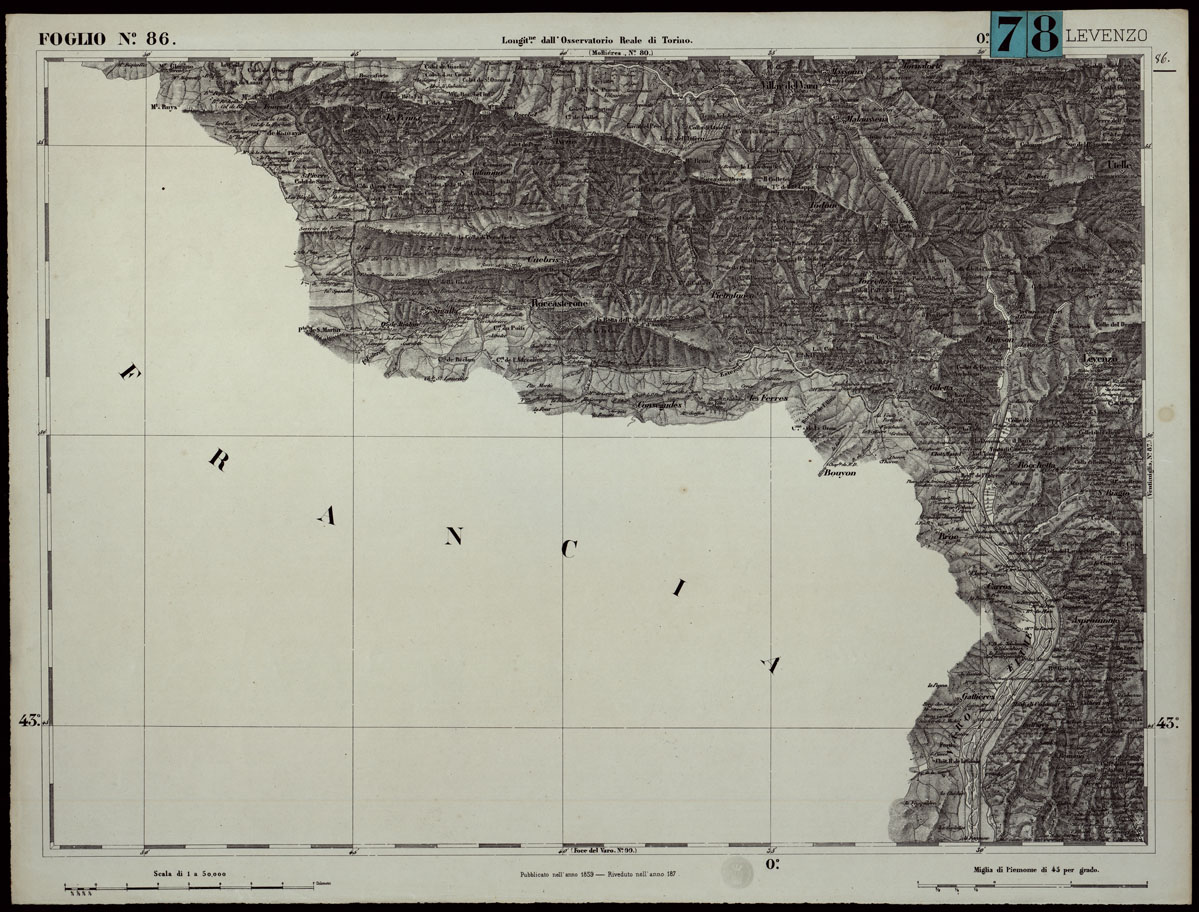 CARTA TOPOGRAFICA DEGLI STATI IN TERRAFERMA DI S.M. IL RE DI SARDEGNA ALLA SCALA DI 1.A 50.000. OPERA DEL CORPO REALE DELLO STATO MAGGIORE - FOGLIO N.°86. LEVENZO