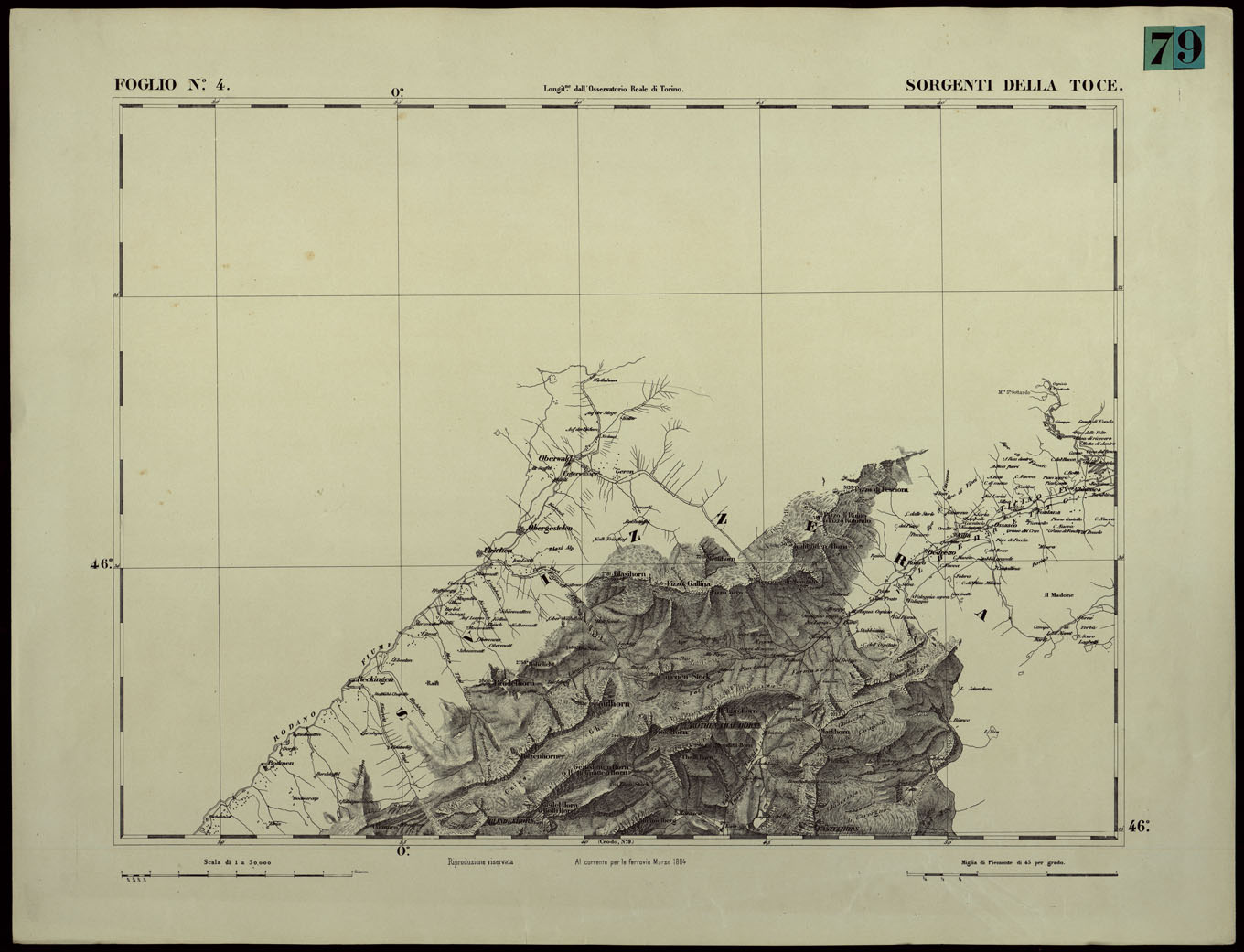 CARTA TOPOGRAFICA DEGLI STATI IN TERRAFERMA DI S.M. IL RE DI SARDEGNA ALLA SCALA DI 1.A 50.000. OPERA DEL CORPO REALE DELLO STATO MAGGIORE - FOGLIO N.°4. SORGENTI DELLA TOCE