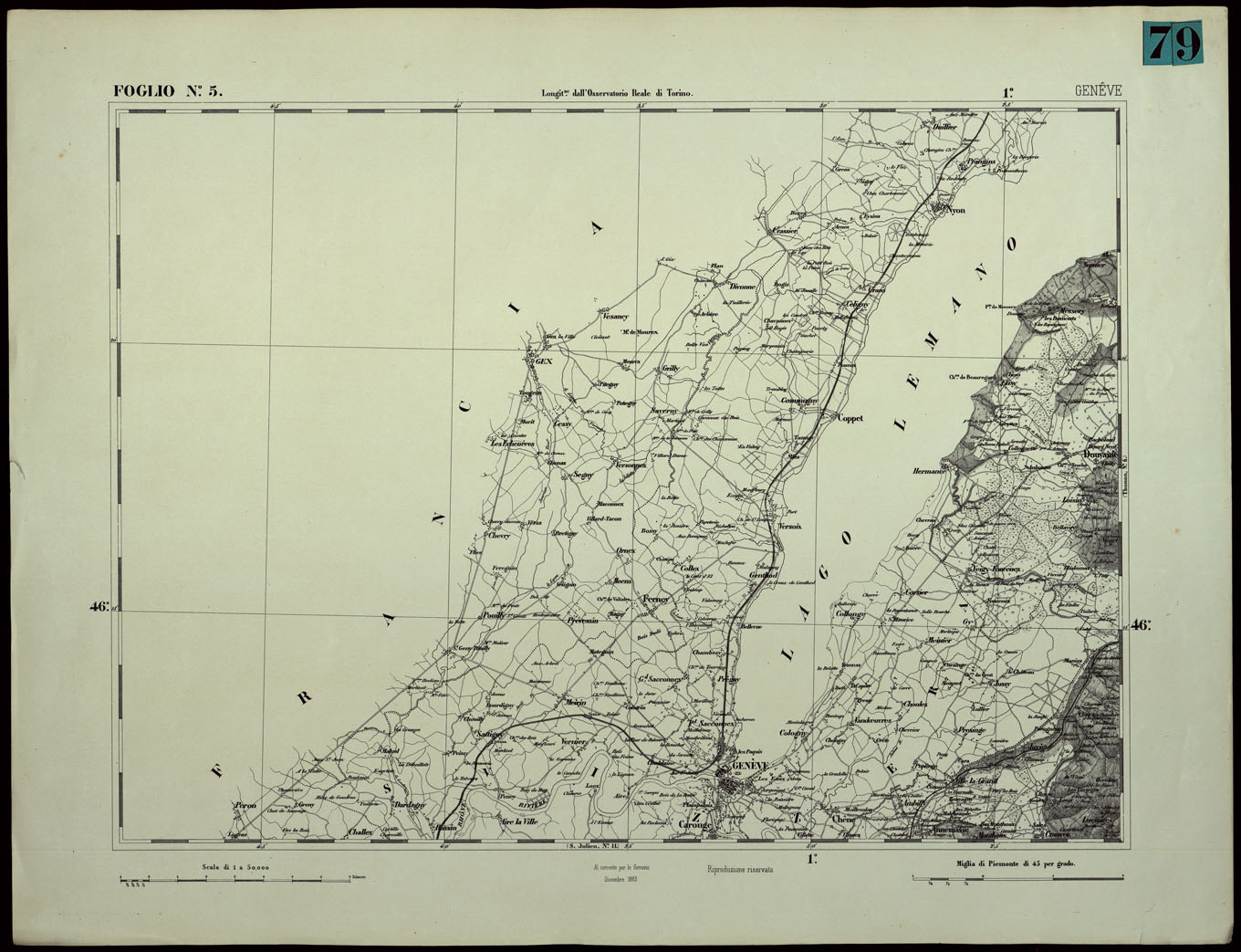 CARTA TOPOGRAFICA DEGLI STATI IN TERRAFERMA DI S.M. IL RE DI SARDEGNA ALLA SCALA DI 1.A 50.000. OPERA DEL CORPO REALE DELLO STATO MAGGIORE - FOGLIO N.°5. GENEVE