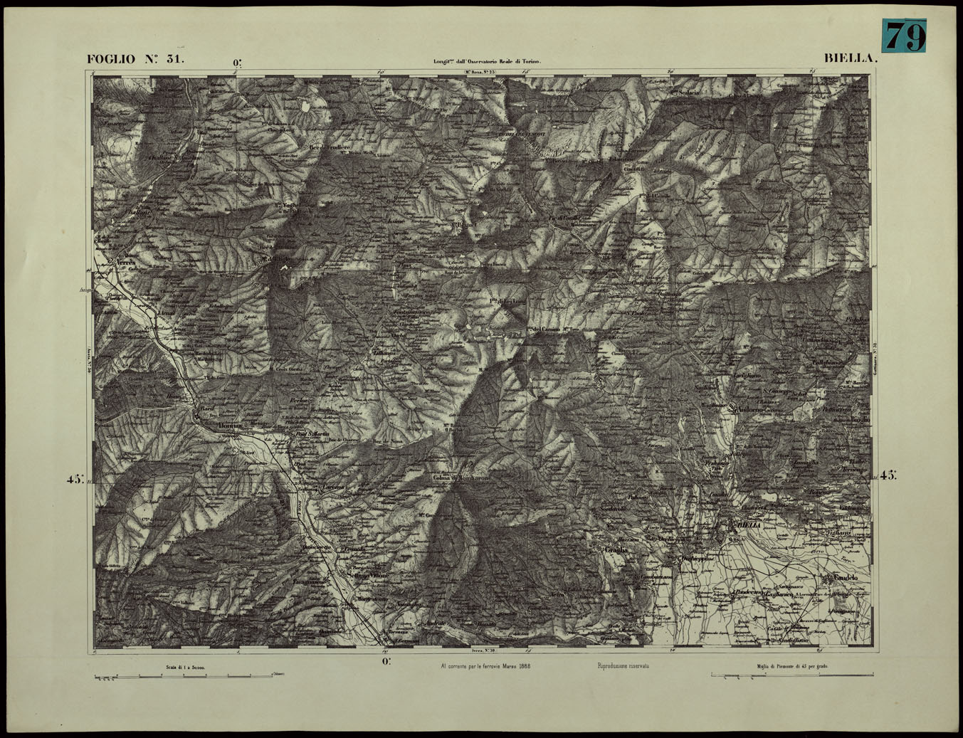 CARTA TOPOGRAFICA DEGLI STATI IN TERRAFERMA DI S.M. IL RE DI SARDEGNA ALLA SCALA DI 1.A 50.000. OPERA DEL CORPO REALE DELLO STATO MAGGIORE - FOGLIO N.°31. BIELLA