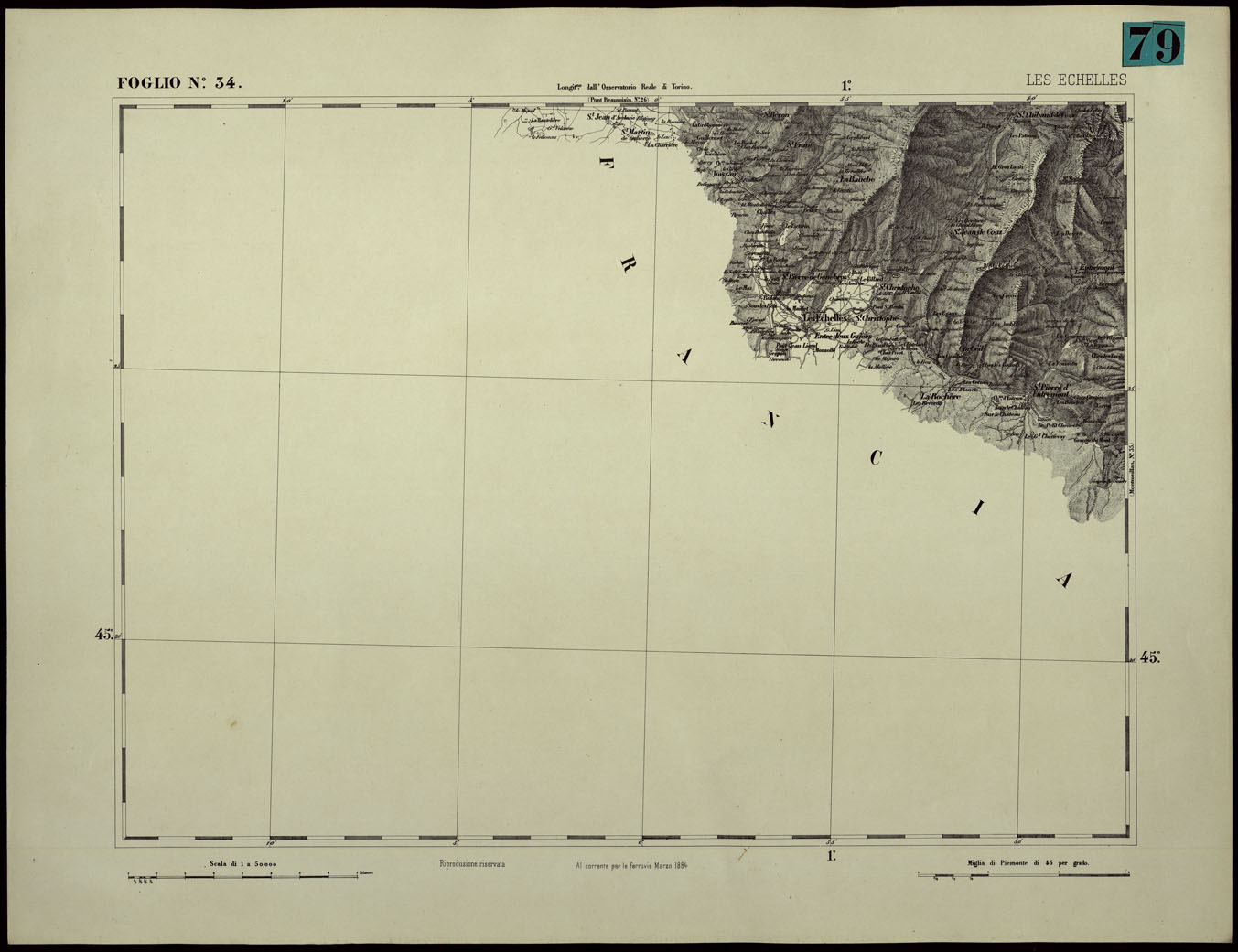 CARTA TOPOGRAFICA DEGLI STATI IN TERRAFERMA DI S.M. IL RE DI SARDEGNA ALLA SCALA DI 1.A 50.000. OPERA DEL CORPO REALE DELLO STATO MAGGIORE - FOGLIO N.°34. LES ECHELLES