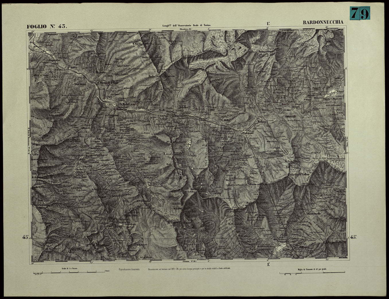 CARTA TOPOGRAFICA DEGLI STATI IN TERRAFERMA DI S.M. IL RE DI SARDEGNA ALLA SCALA DI 1.A 50.000. OPERA DEL CORPO REALE DELLO STATO MAGGIORE - FOGLIO N.°43. BARDONECCHIA