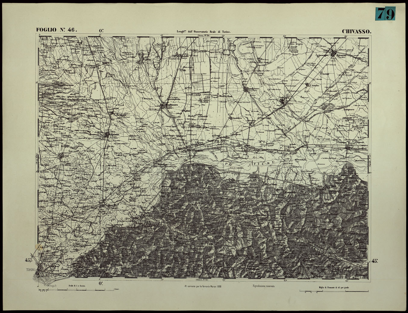 CARTA TOPOGRAFICA DEGLI STATI IN TERRAFERMA DI S.M. IL RE DI SARDEGNA ALLA SCALA DI 1.A 50.000. OPERA DEL CORPO REALE DELLO STATO MAGGIORE - FOGLIO N.°46. CHIVASSO