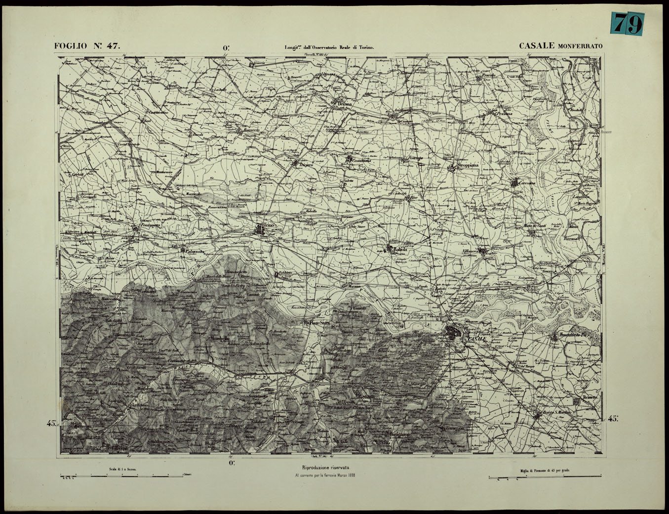 CARTA TOPOGRAFICA DEGLI STATI IN TERRAFERMA DI S.M. IL RE DI SARDEGNA ALLA SCALA DI 1.A 50.000. OPERA DEL CORPO REALE DELLO STATO MAGGIORE - FOGLIO N.°47. CASALE MONFERRATO