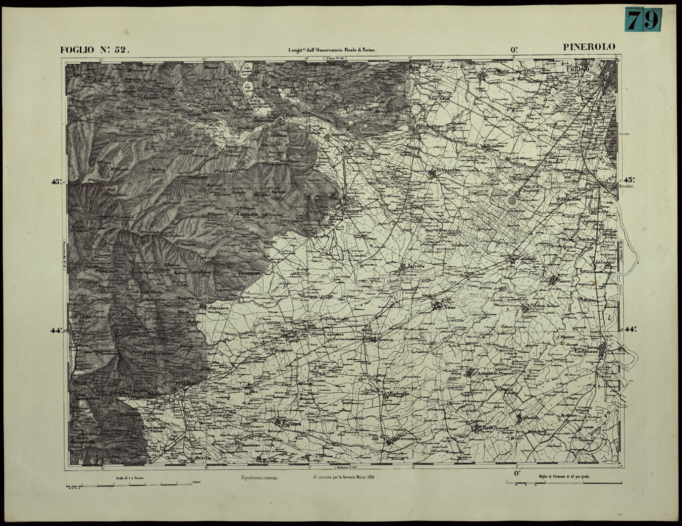 CARTA TOPOGRAFICA DEGLI STATI IN TERRAFERMA DI S.M. IL RE DI SARDEGNA ALLA SCALA DI 1.A 50.000. OPERA DEL CORPO REALE DELLO STATO MAGGIORE - FOGLIO N.°52. PINEROLO